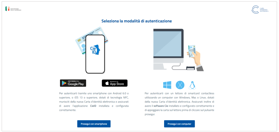 - se la navigazione viene eseguita da PC, si verrà reindirizzati alla pagina del Ministero dell’Interno nella quale procedere con la selezione del metodo di autenticazione.