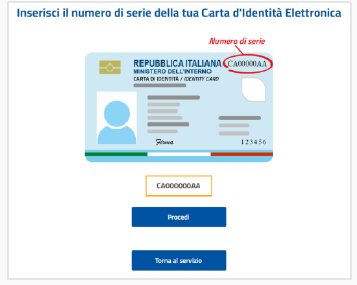 Verrà richiesto l’inserimento del numero di serie della Carta di Identità Elettronica. Una volta inserito, cliccare su Procedi.